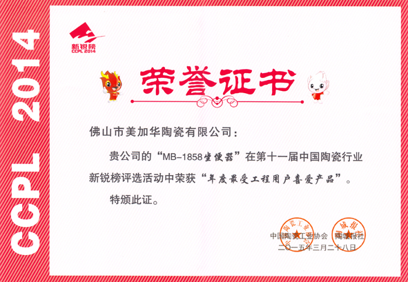 3月28日,“第十一屆中國陶瓷行業(yè)新銳頒獎典禮”、“中國制造?佛山論壇”在佛山新媒體產(chǎn)業(yè)園隆重舉行,美加華衛(wèi)浴旗下MB-1858連體坐便器喜獲新銳榜“年度最受工程用戶喜愛產(chǎn)品”獎。